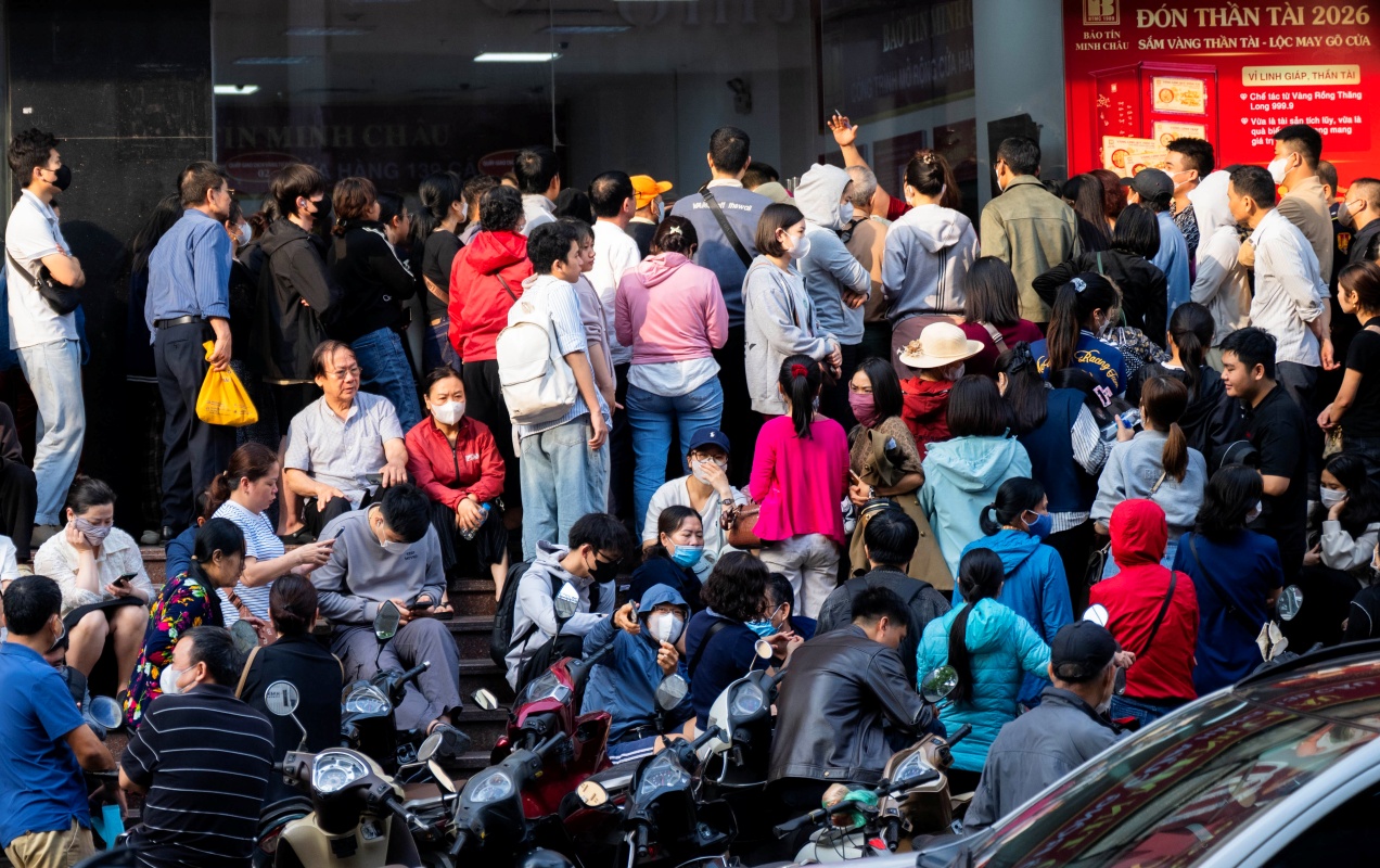 Giá vàng biến động mạnh, người Hà Nội vẫn xếp hàng từ sáng sớm, chen kín tiệm tranh thủ mua tích trữ và chuẩn bị cho việc cưới hỏi dù phải chờ đợi nhiều giờ.