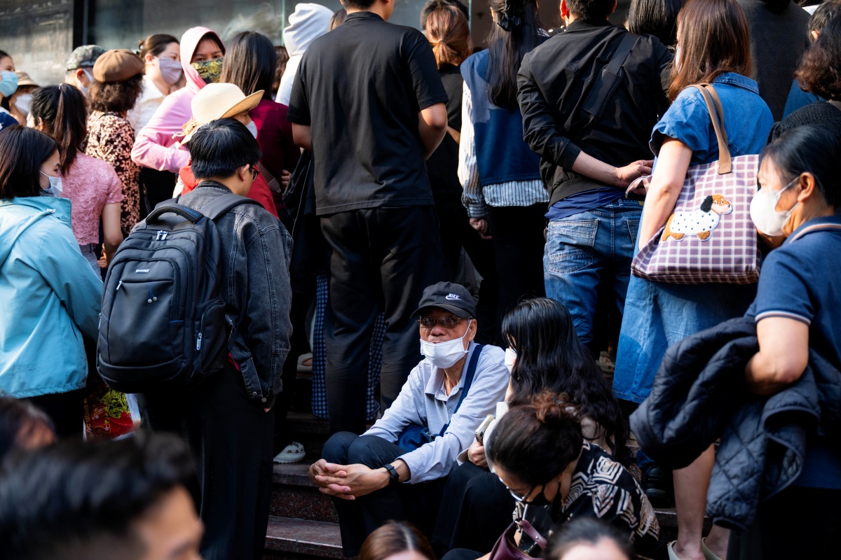 Không khí đông đúc bao trùm cửa hàng, người dân kiên nhẫn chờ đợi giữa dòng người chen chúc.