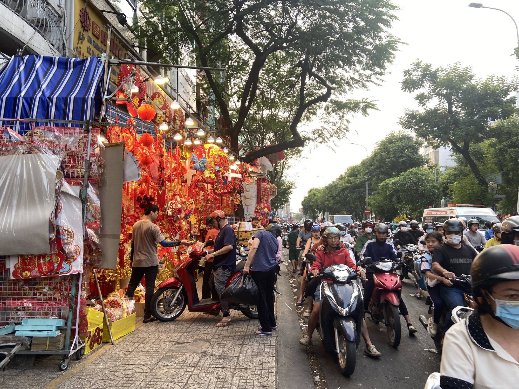 Trên đường Hải Thượng Lãn Ông, tuyến phố chuyên bán đồ trang trí Tết của khu vực Chợ Lớn, không khí mua bán vẫn sôi động với đủ loại mặt hàng như đèn lồng, câu đối, bao lì xì, dây treo trang trí, vật phẩm phong thủy. Những năm trước, các cửa hàng tại đây thường bày hàng tràn lan ra vỉa hè, thậm chí lấn xuống lòng đường để chèo kéo khách, khiến người đi bộ gặp nhiều khó khăn.
