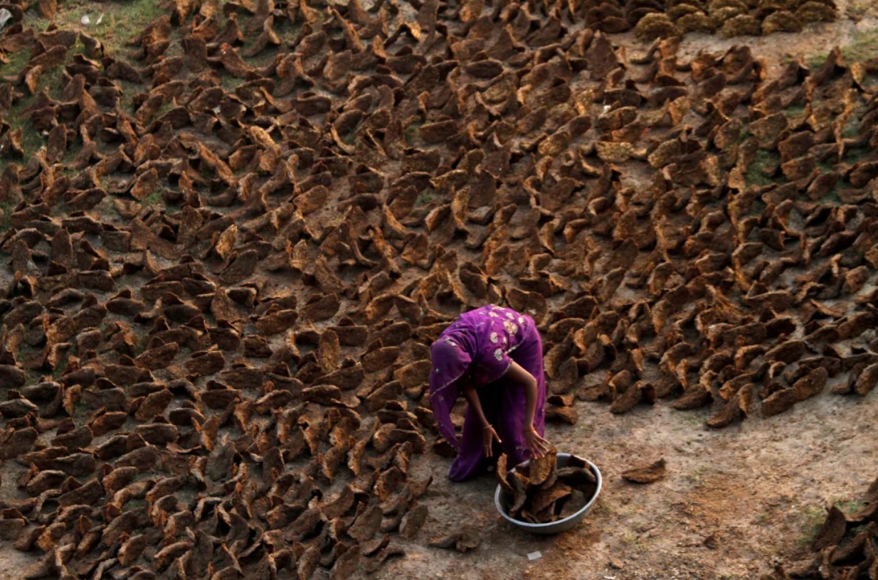 Một người phụ nữ đang phơi bánh phân bò khô để làm khí đốt nấu ăn hàng ngày