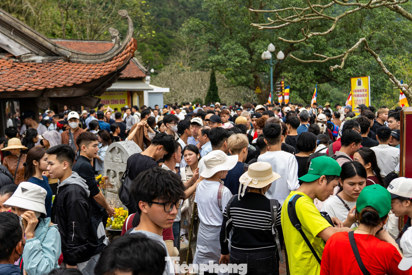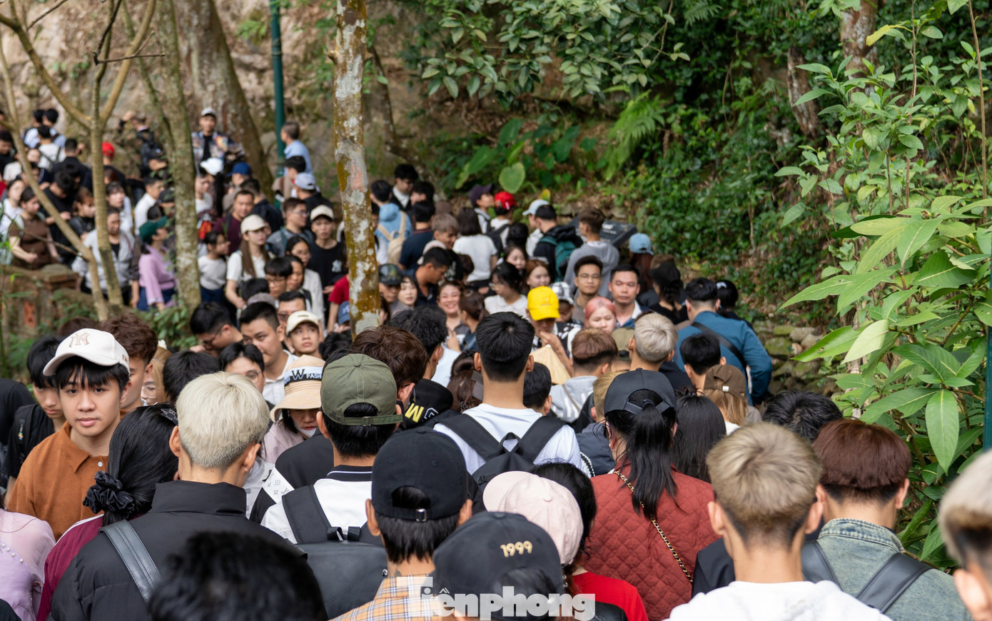 Cùng với đó, từ khoảng 9h hàng vạn du khách đổ về núi Yên Tử khiến con đường dốc thẳng đứng từ tháp Tổ lên chùa Hoa Yên ken chặt người.