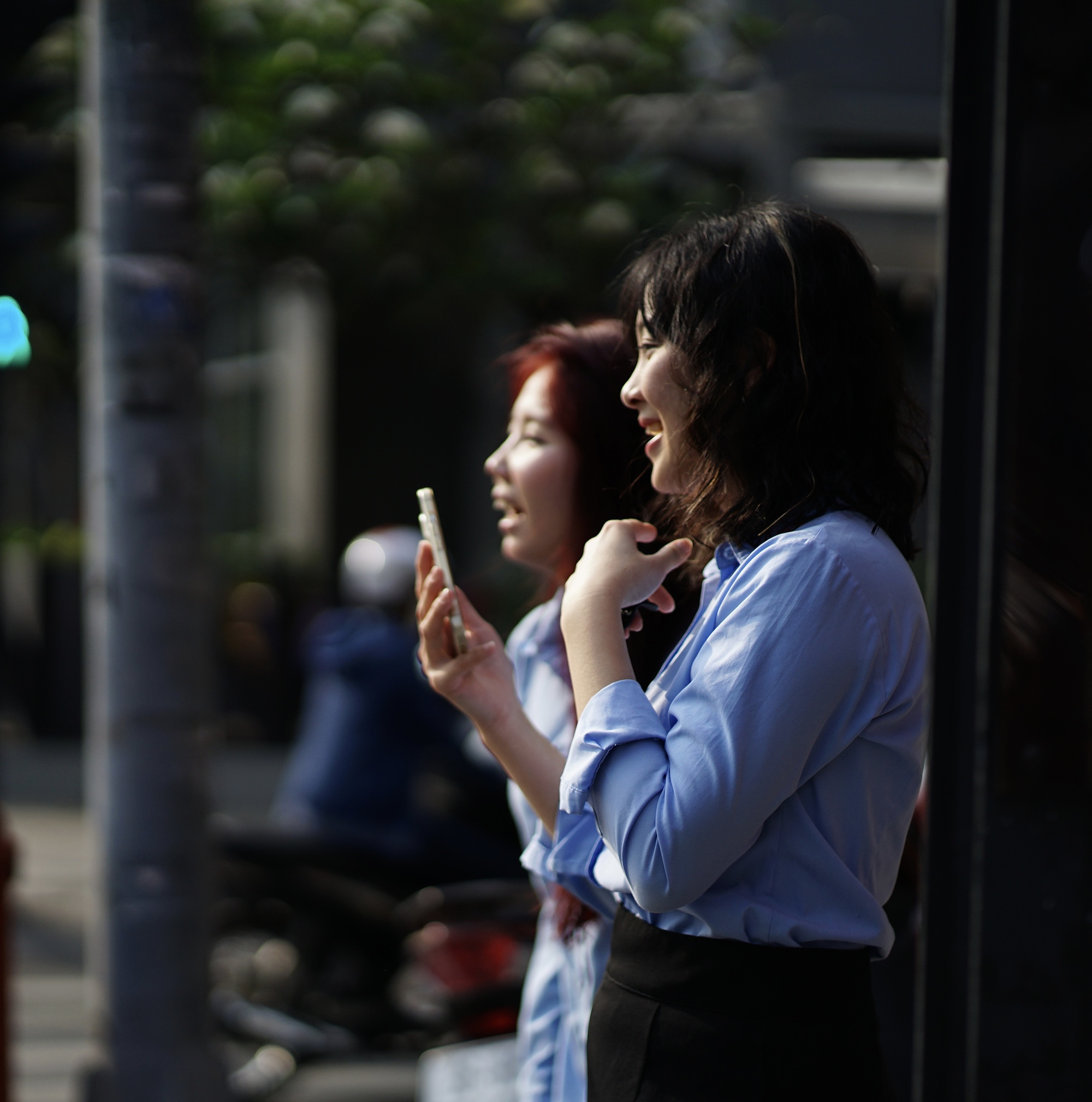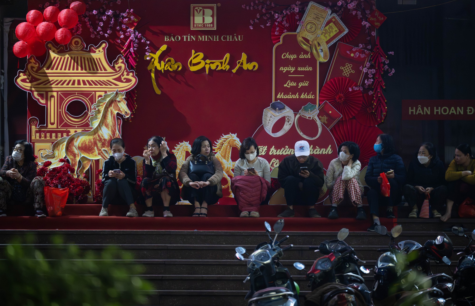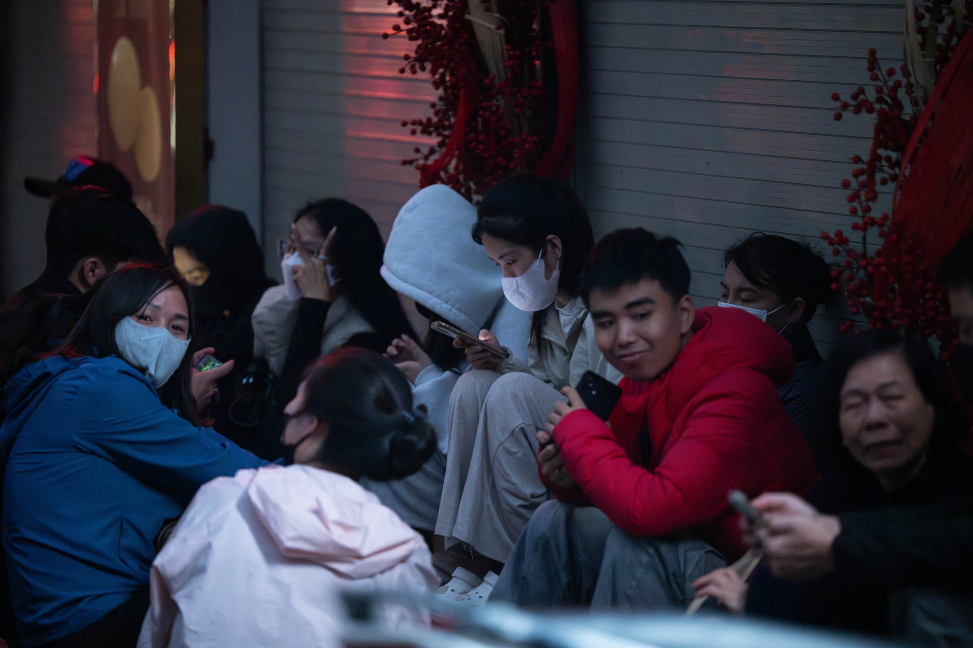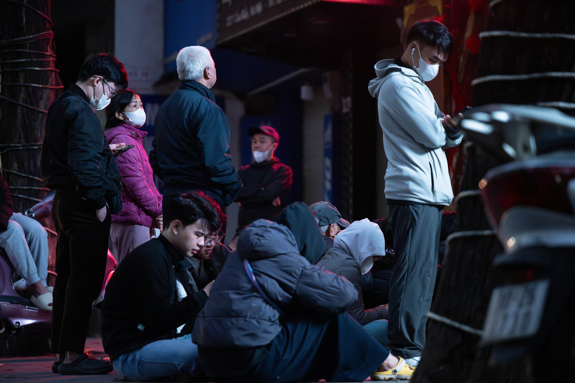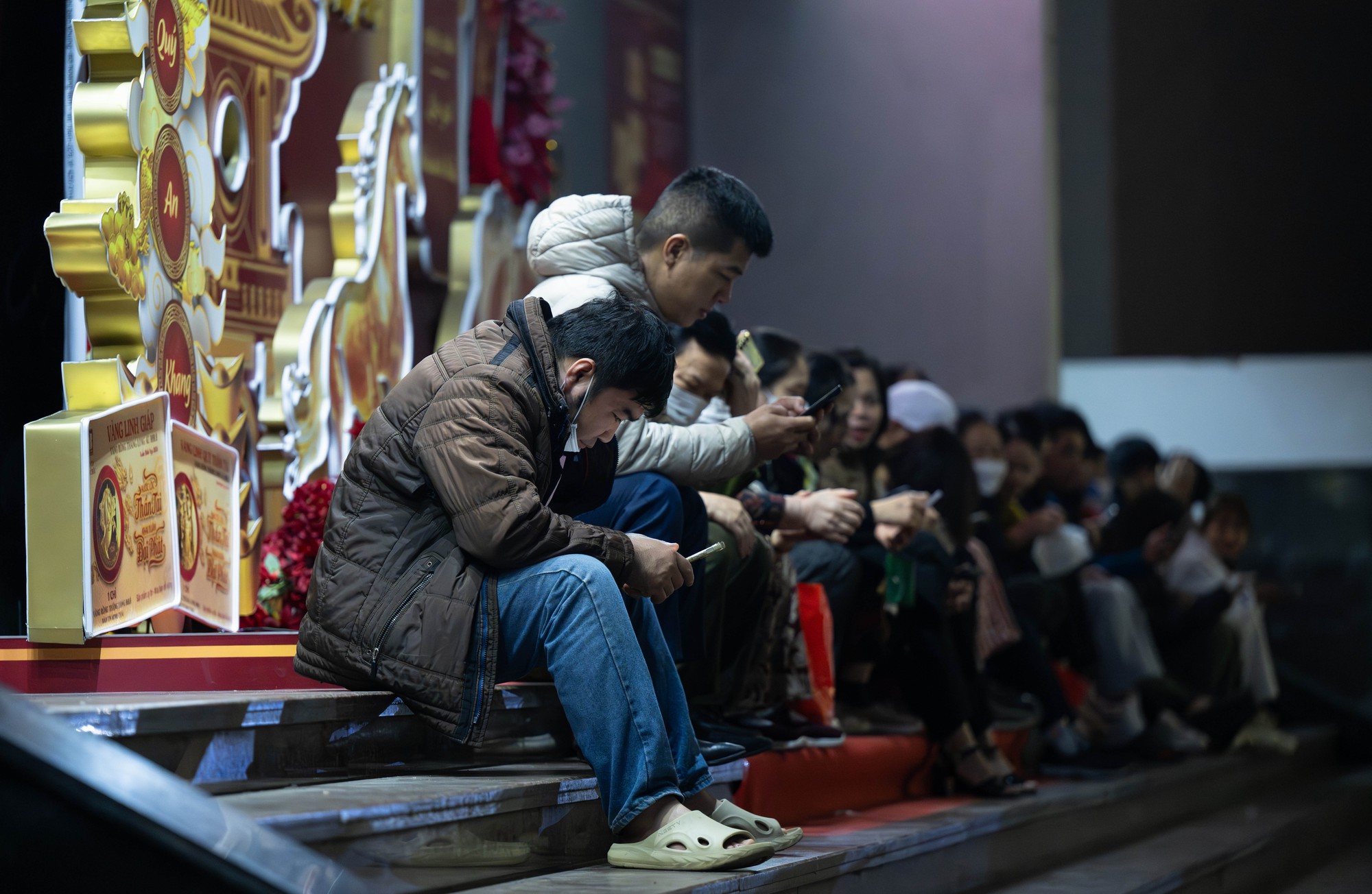 Nhiều khách hàng ngồi chờ đợi trên bậc thềm trước cửa hàng, tranh thủ lướt điện thoại cho nhanh hết thời gian