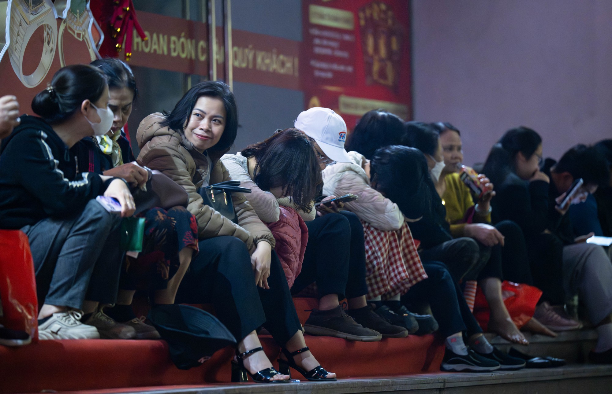 Những cuộc trò chuyện rôm rả giữa người mua vàng khiến thời gian chờ đợi bớt dài trong tiết trời se lạnh đầu năm.