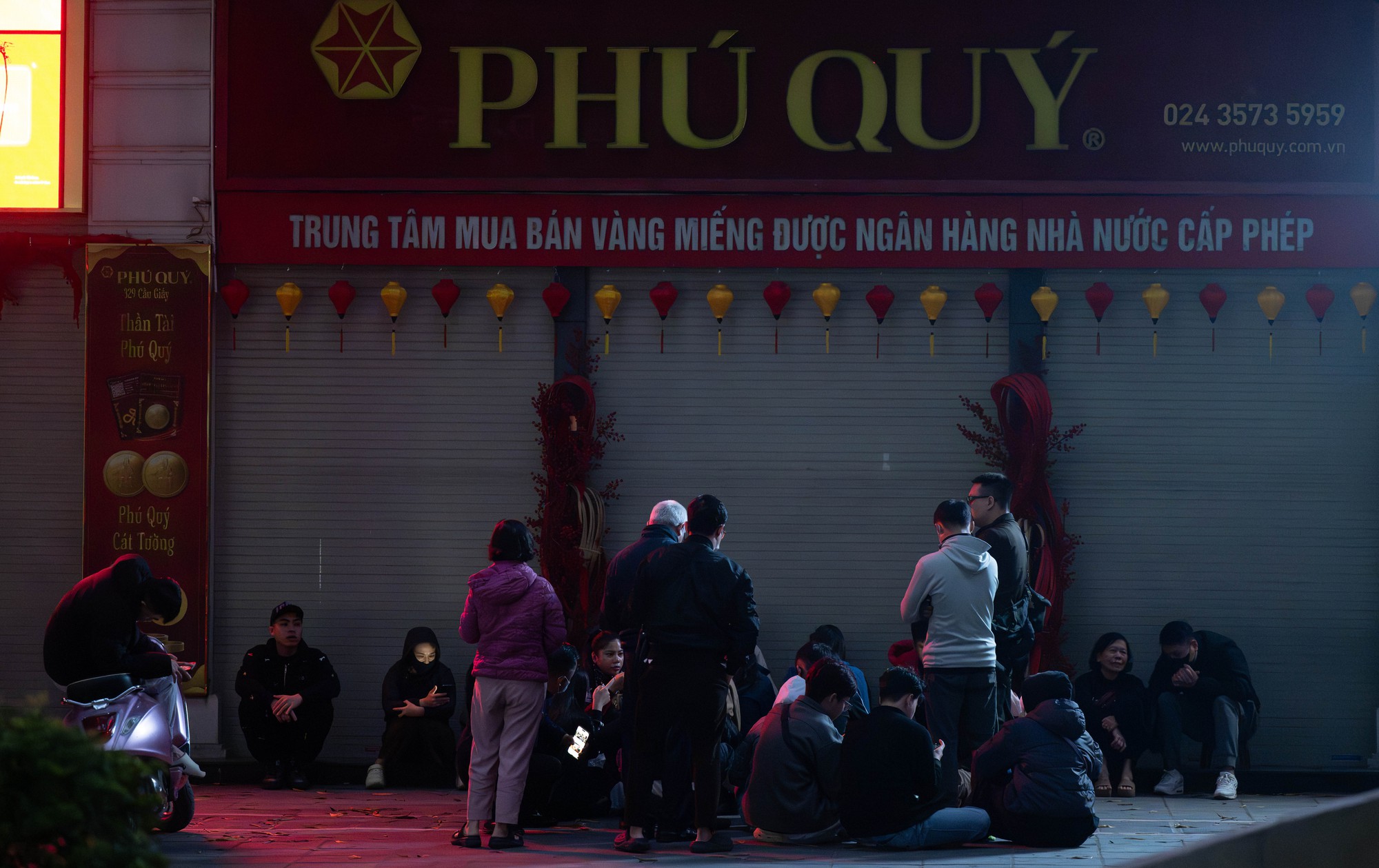 Người dân có mặt từ 3-4h sáng trước cửa tiệm vàng trên đường Cầu Giấy, chấp nhận xếp hàng nhiều giờ để mua vàng cầu may trước ngày vía Thần Tài.