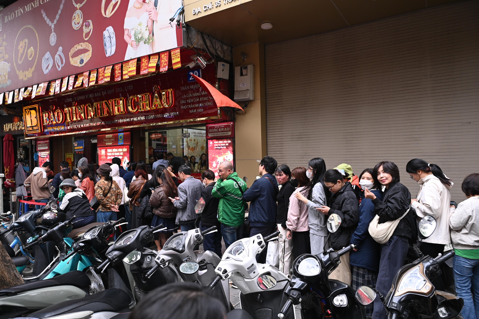 Người dân xếp hàng dài trước tiệm vàng trên phố Trần Nhân Tông (Hà Nội) trong bối cảnh giá vàng liên tục lập đỉnh.