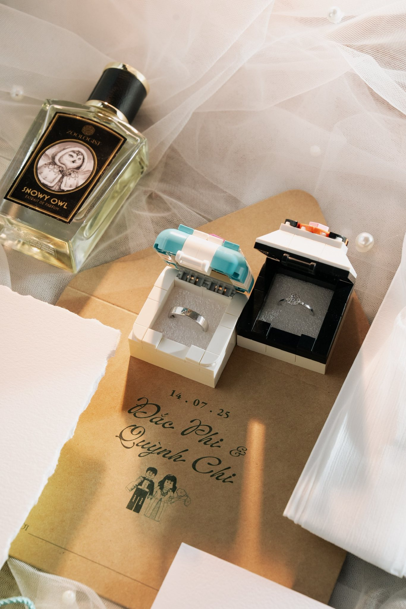 Chuyện gì đến cũng phải đến. Được sự đồng ý của vợ và gia đình, mình có thêm thắt 1 chút Lego vào trang phục và tiệc cưới, trong đó có bội áo dài và hộp nhẫn mình tự ghép và khá tâm đắc. Mình cũng học lỏm đám cưới nước ngoài và thiết kế Lego guest list cùng với lễ cất nóc nhà Lego, và thậm chí cho vào lời vows của mình nữa".