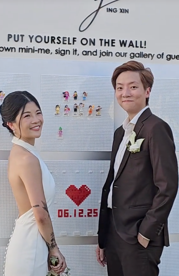 Kết quả là các khối Lego được tích hợp vào thiết kế áo dài cưới của cặp đôi. Điểm chú ý về mặt kỹ thuật là hộp đựng nhẫn cưới do chính chú rể thiết kế và lắp ráp (MOC - My Own Creation).