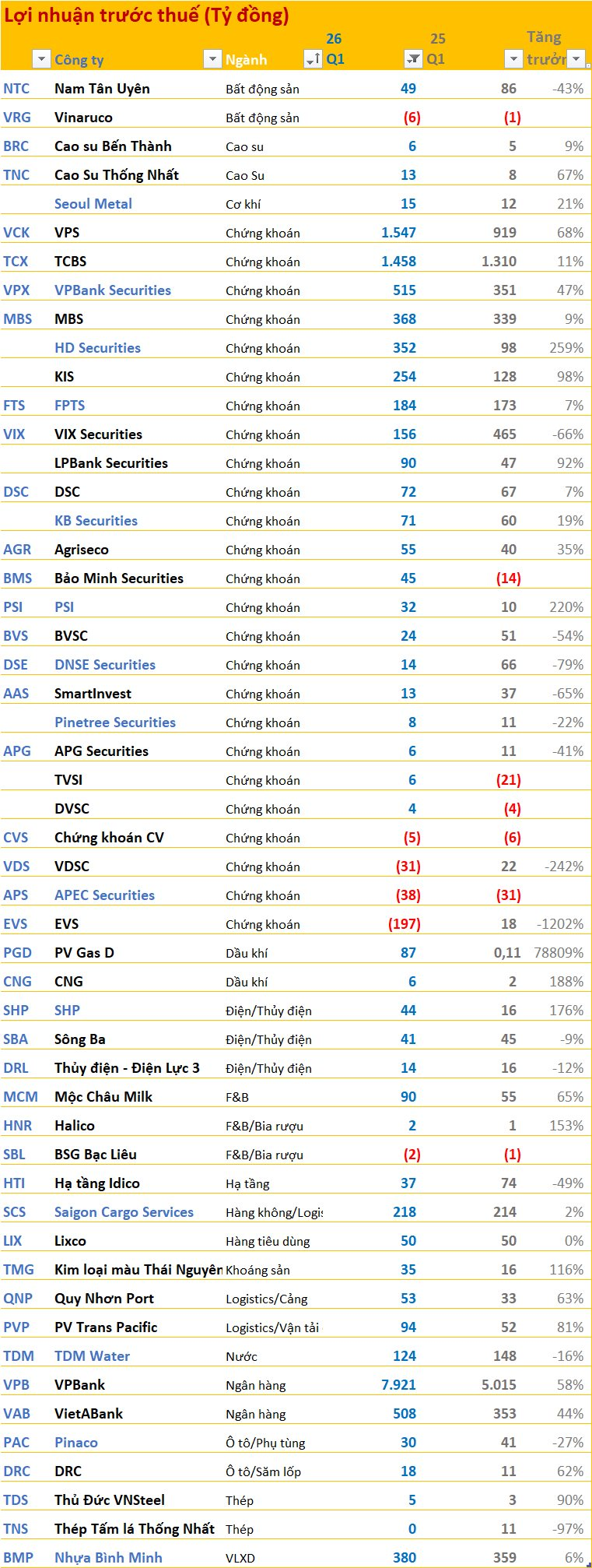 Các doanh nghiệp đã công bố BCTC quý 1/2026 sắp xếp theo ngành: