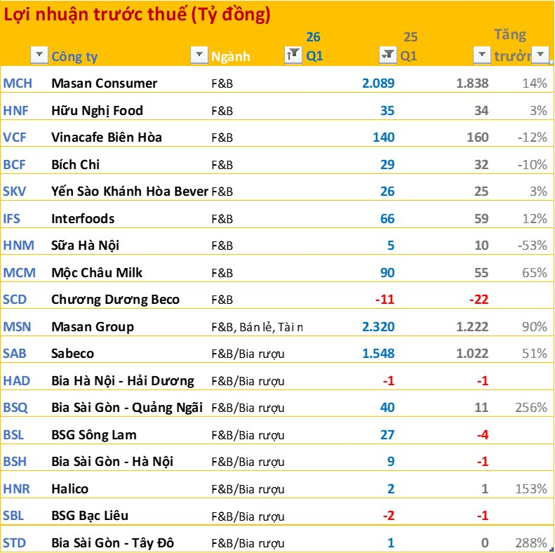 F&B có sự hồi phục tốt, tiêu biểu là Masan Group (MSN) tăng trưởng 90% và Sabeco (SAB) tăng 51%. Masan Consumer (MCH) tiếp tục là "con gà đẻ trứng vàng" với lợi nhuận trên 2.000 tỷ đồng.