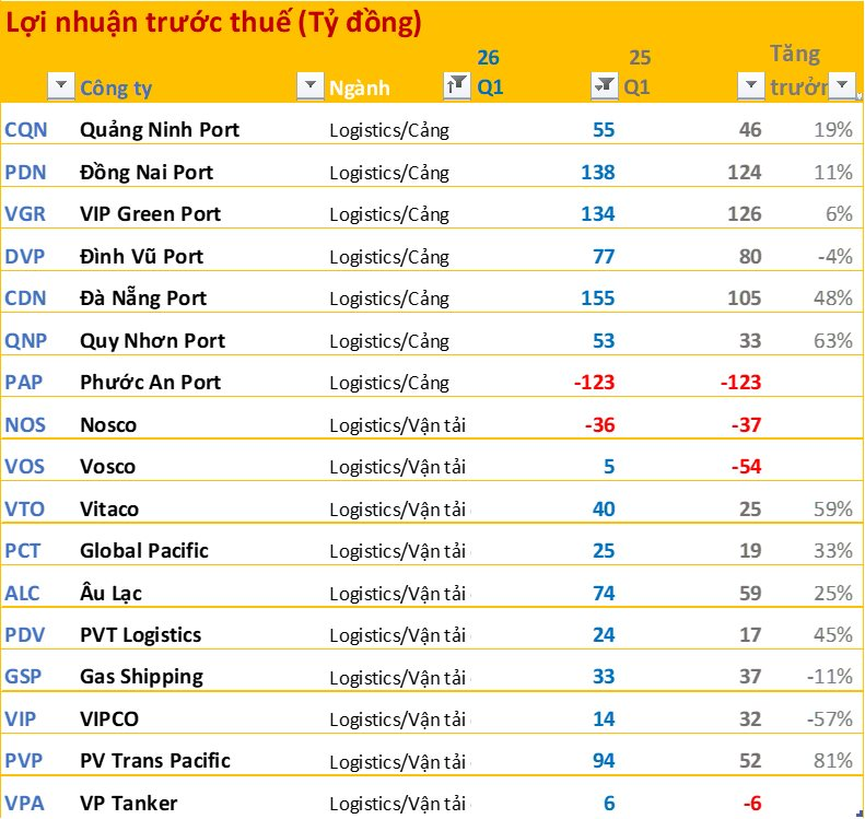 Nhóm cảng biển duy trì sắc xanh ổn định với mức tăng trưởng trung bình từ 10% - 60%. Ngược lại, mảng vận tải biển vẫn còn những mảng tối khi một số doanh nghiệp như Nosco hay Phước An Port vẫn chưa thoát lỗ.