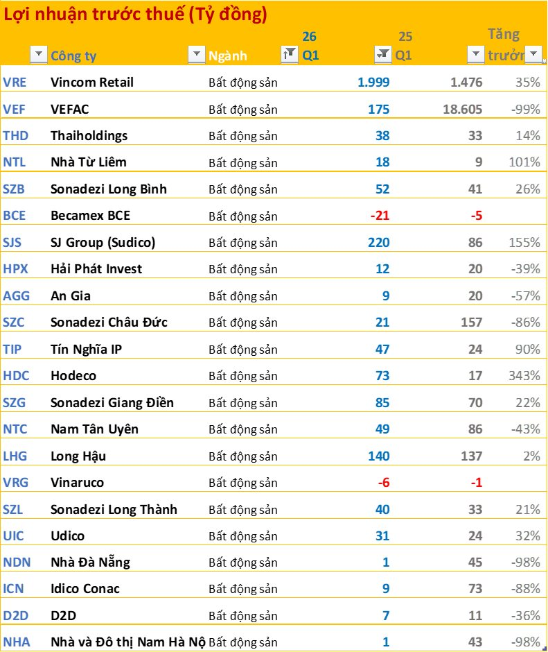 Bức tranh lợi nhuận có sự tách biệt lớn; trong khi Vincom Retail (VRE) và SJ Group (SJS) tăng trưởng ấn tượng, thì nhiều doanh nghiệp khác như VEFAC (VEF) hay Nhà Đà Nẵng (NDN) lại sụt giảm lợi nhuận đến hơn 98%.