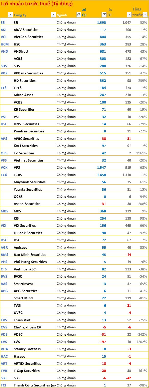 Thị trường phân hóa rõ rệt; các công ty lớn như SSI, VPS, TCBS đều báo lãi nghìn tỷ và tăng trưởng hai chữ số. Tuy nhiên, nhóm quy mô nhỏ hơn gặp khó khăn lớn với nhiều đơn vị báo lỗ sâu như EVS (-197 tỷ đồng) hay VDS.