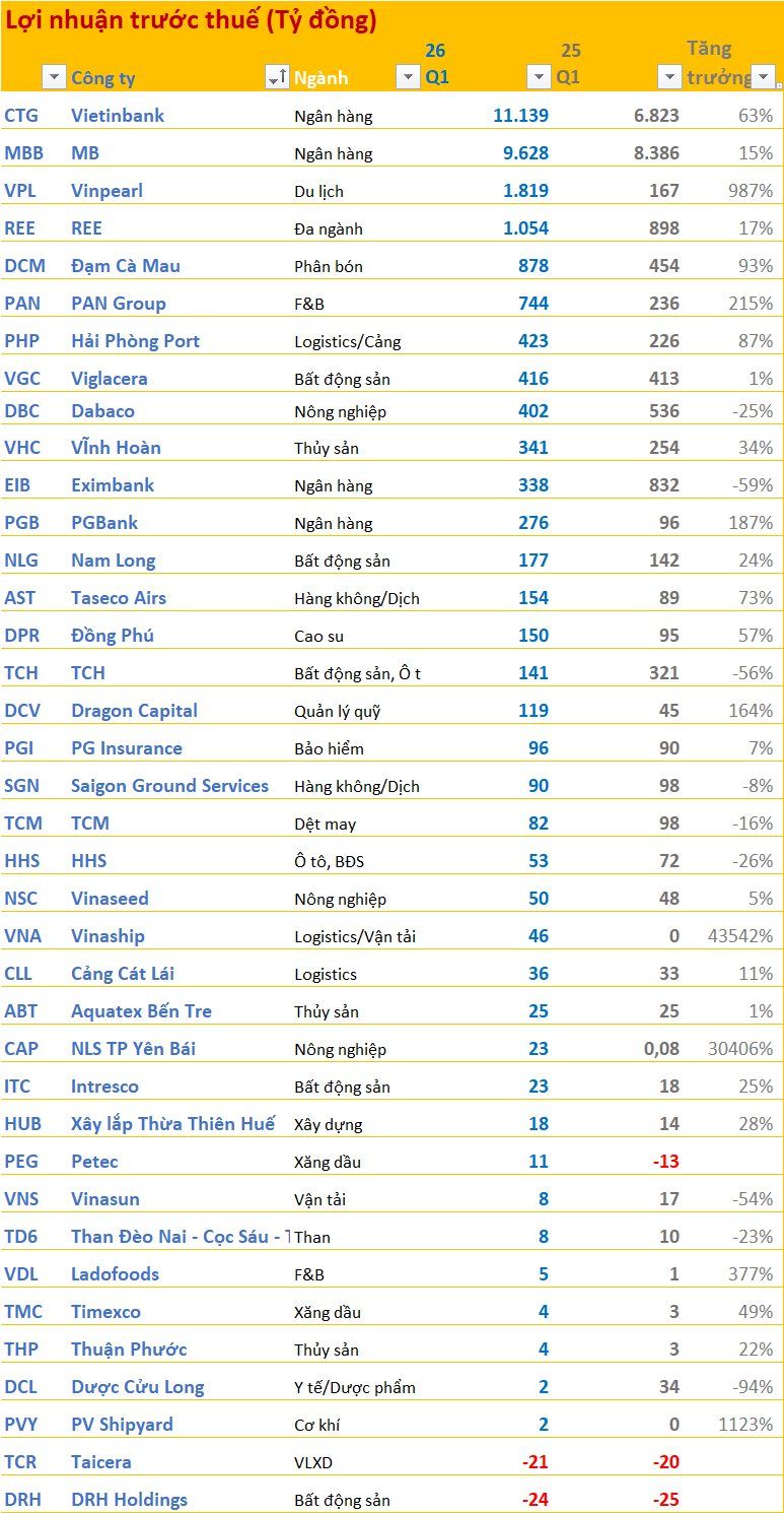 Các doanh nghiệp đã công bố BCTC quý 1/2026 sắp xếp theo ngành: