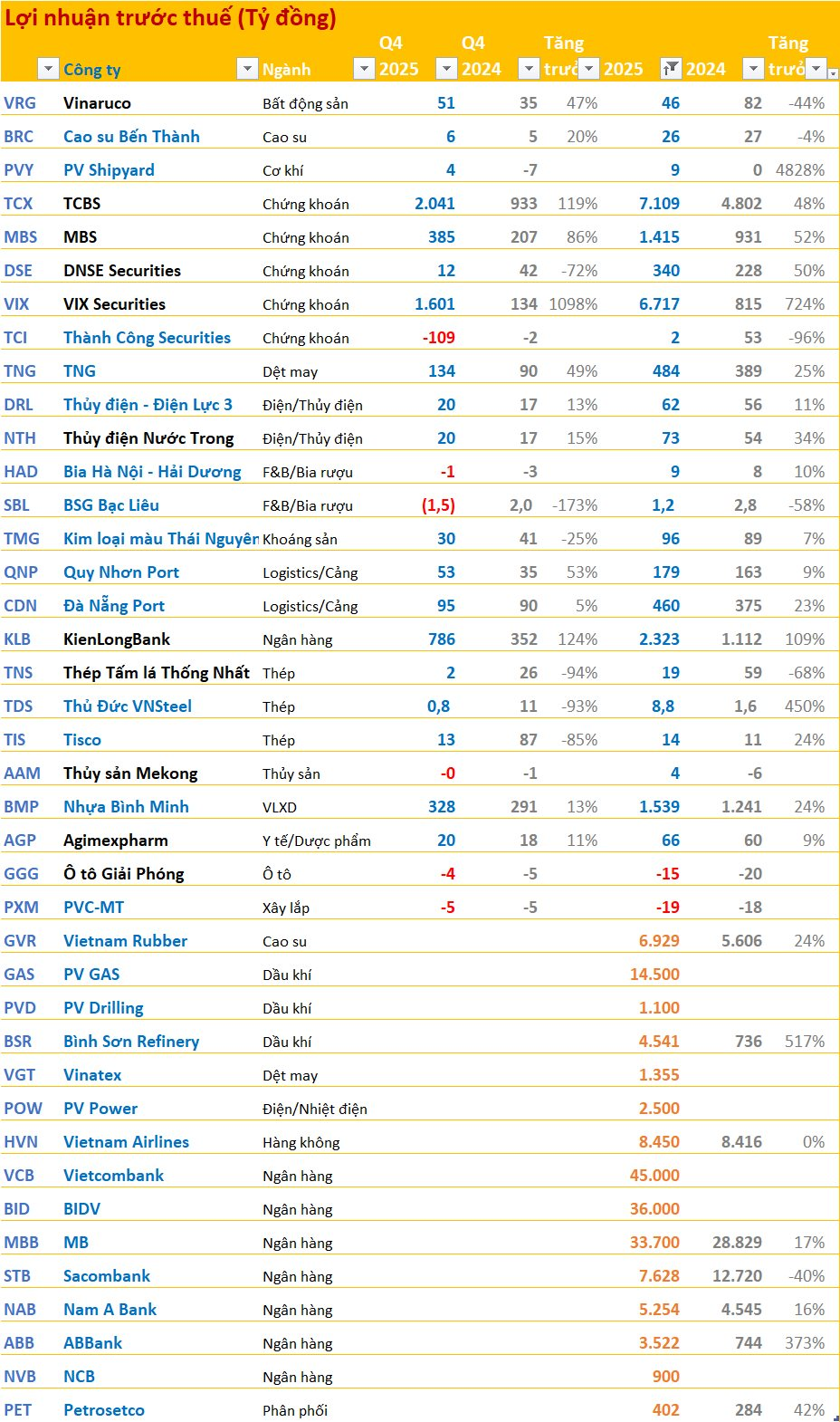 Các doanh nghiệp đã công bố BCTC quý 4/2025 và ước tính kết quả kinh doanh 2025: