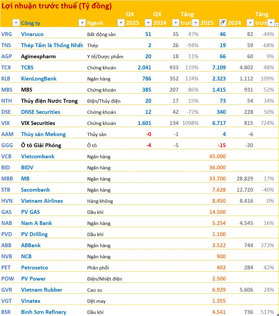 Các doanh nghiệp đã công bố BCTC quý 4/2025 và ước tính kết quả kinh doanh năm 2025: