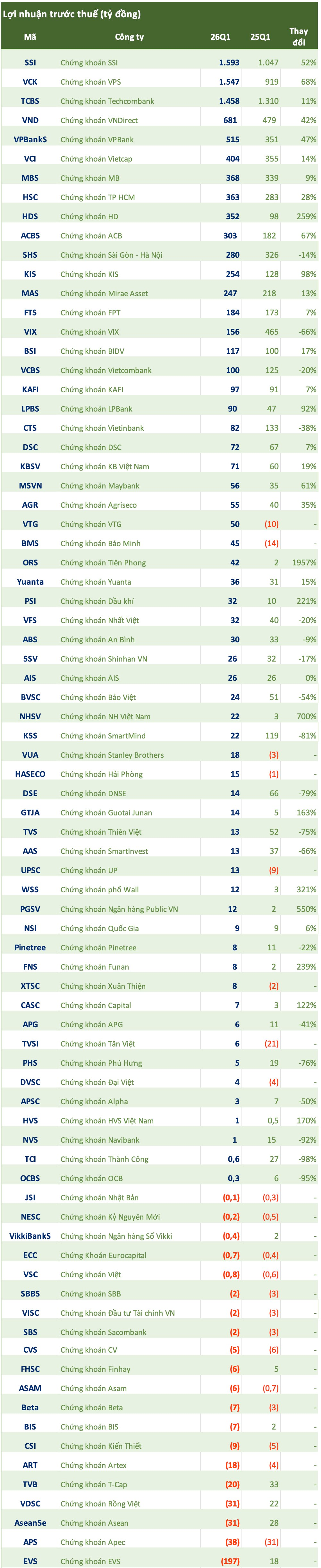 Ngôi vương lợi nhuận quý 1/2026 đã thuộc về Chứng khoán SSI với mức lãi trước thuế đạt 1.593 tỷ đồng, tăng 52% so với cùng kỳ năm ngoái.