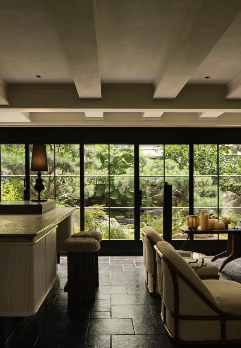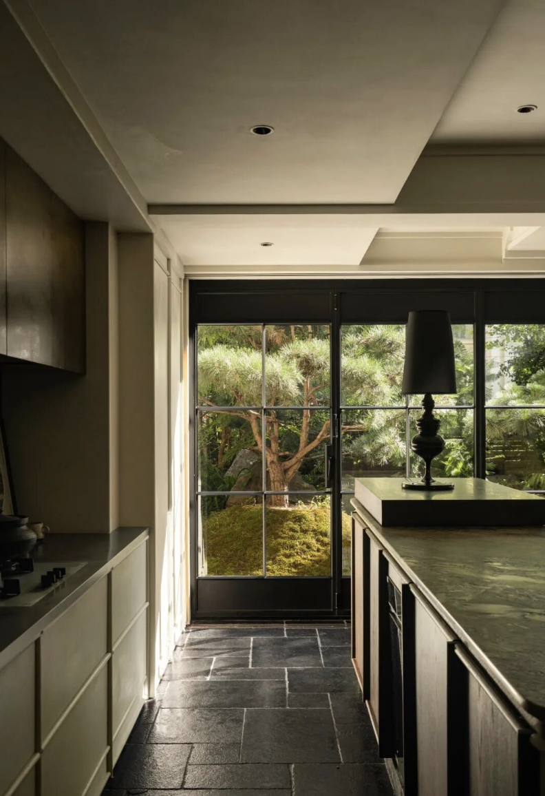 Bên trong ngôi nhà, sàn đá vôi đen được sử dụng để tạo cảm giác trầm tĩnh, làm nổi bật mảng xanh bên ngoài. Phòng tắm lát gạch tối màu, khi mở cửa là khung cảnh cây cối hiện ra ngay trước mắt.