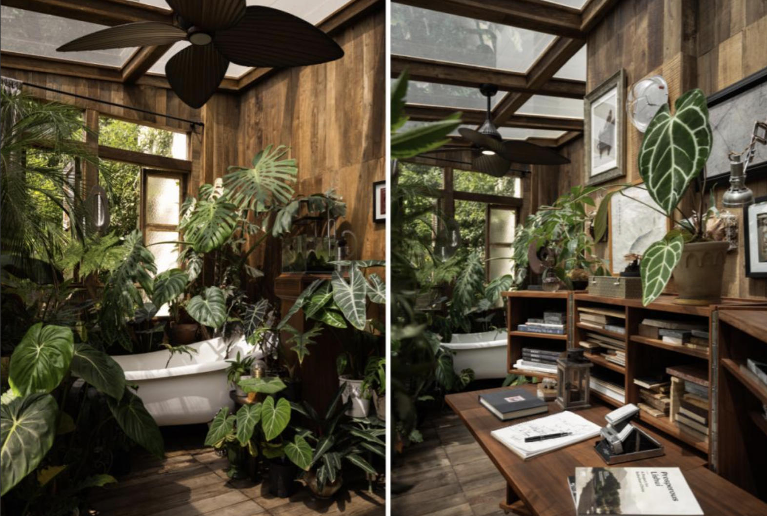 Khu vườn có hình chữ U, chia thành vườn trước và vườn sau. Cặp đôi yêu thích cảm giác của một khu rừng. Ba cây thông đen được trồng làm điểm nhấn, cùng với vườn cây ăn quả và khoảng 60-70 loại cây khác. Hệ thống tưới tự động được điều khiển bằng điện thoại giúp khu vườn phát triển ổn định, kể cả khi họ đi công tác xa.