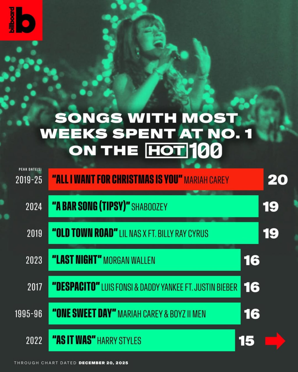 Mới đây, nữ ca sĩ đón tin vui khi siêu hit All I Want For Christmas Is You đã lập kỷ lục khi trở thành ca khúc đứng hạng 1 Billboard Hot 100 lâu nhất với 20 tuần, đánh bại Old Town Road của Lil Nas X và A Bar Song của Shaboozey. Thành công này giúp Mariah lần thứ hai trong sự nghiệp thiết lập kỷ lục về thời gian trụ vững ở vị trí quán quân. Trước đó, bản hit song ca One Sweet Day cùng Boyz II Men từng thống trị Billboard Hot 100 suốt 16 tuần trong giai đoạn 1995–1996 và nắm giữ kỷ lục này hơn 23 năm.