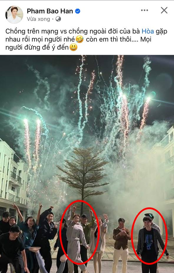 Cho đến mới đây, cư dân mạng đã có câu trả lời. Diễn viên Bảo Hân (Về Nhà Đi Con) vừa công khai hình ảnh hội bạn thân gặp gỡ nhau. Trong ảnh có nhiều đôi vợ chồng như Doãn Hải My - Văn Hậu, vợ chồng Thành Chung... Đặc biệt, Hoà Minzy và Văn Cương cũng có mặt, cả hai đứng cạnh nhau "đánh dấu chủ quyền". Chi tiết gây chú ý hơn cả chính là cầu thủ Văn Toàn cũng xuất hiện trong bức ảnh hội bạn này. Bảo Hân hài hước chia sẻ: "Chồng trên mạng với chồng ngoài đời của bà Hòa gặp nhau rồi mọi người nha".