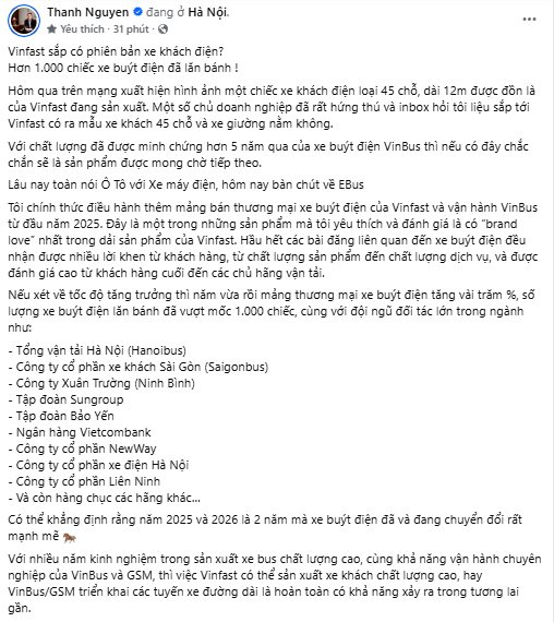 Theo ông Thanh, nếu dựa trên những gì VinFast đã thể hiện trong lĩnh vực xe buýt điện, việc hãng mở rộng sang xe khách điện là hoàn toàn có cơ sở. Hiện nay, hệ thống xe buýt điện VinBus đã vận hành hơn 1.000 xe trên nhiều địa phương. Sau gần 5 năm hoạt động, các phương tiện này được đánh giá ổn định về chất lượng, từ vận hành đến dịch vụ, qua đó tạo nền tảng kinh nghiệm quan trọng cho các dòng xe lớn hơn.