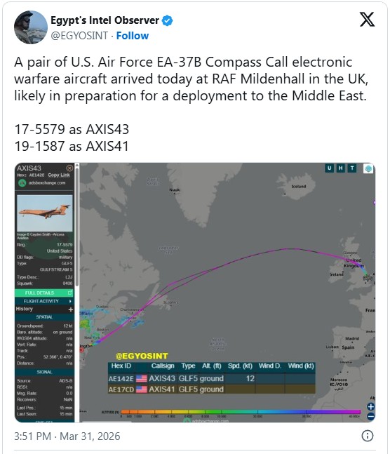 Thông tin cho thấy hai máy bay tác chiến điện tử EA-37B Compass Call của Không quân Mỹ đã đến căn cứ RAF Mildenhall ở Anh vào ngày 31/3, rất có thể là để chuẩn bị cho việc triển khai đến Trung Đông. Ảnh chụp màn hình bài đăng trên nền tảng X