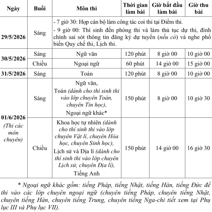 Đúng 9h sáng 29/5, các điểm thi sẽ tổ chức học quy chế thi cho thí sinh, thông báo bảng ghi tên dự thi để thí sinh kiểm tra, báo cáo sai sót cho điểm thi. Ngày 30 và 31/5, thí sinh sẽ bước vào kỳ thi lớp 10 công lập không chuyên; riêng các thí sinh dự thi vào lớp 10 các trường chuyên sẽ thi thêm các môn chuyên ở ngày 1/6.
