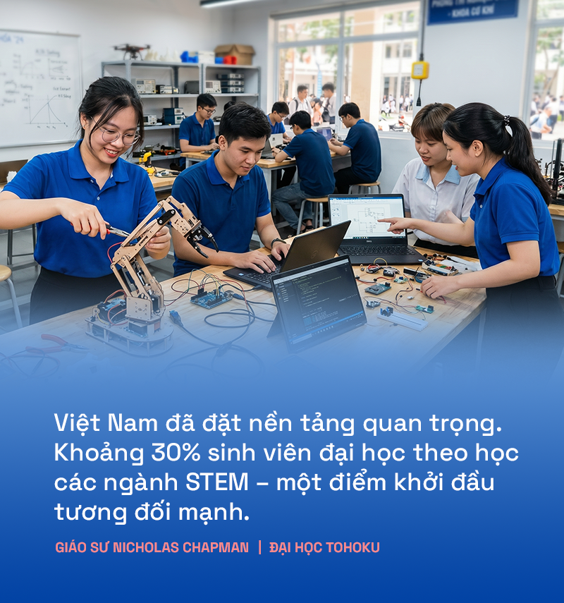 Tuy nhiên, Việt Nam đã đặt nền tảng quan trọng. Khoảng 30% sinh viên đại học theo học các ngành STEM – một điểm khởi đầu tương đối mạnh. Việt Nam cũng đã phát triển các quan hệ đối tác đào tạo quốc tế, chẳng hạn như chương trình hợp tác giữa Đại học Gachon của Hàn Quốc và FPT, cho phép sinh viên học tập cả trong và ngoài nước đồng thời tích lũy kinh nghiệm thực tế tại các công ty hàng đầu như Samsung và SK Hynix.