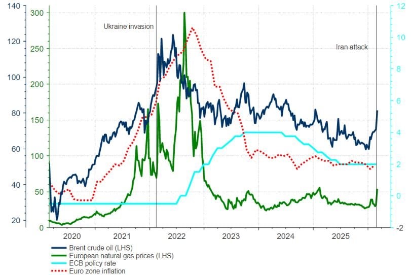 Khi các cuộc tấn công vào Iran cuối tuần qua đánh dấu sự khởi đầu của một cuộc chiến toàn diện - hiện đã lan rộng ra toàn khu vực - và có thể kéo dài ít nhất vài tuần, thị trường châu Âu lập tức chao đảo trước nguy cơ lại phải đối mặt với một cú siết năng lượng nghiêm trọng khác, có thể đẩy lạm phát lên cao và làm suy yếu nhu cầu.