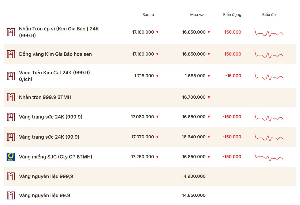 Bảo Tín Mạnh Hải cũng điều chỉnh 1,5 triệu đồng/lượng đối với cả vàng miếng lẫn vàng nhẫn. Theo đó, giá vàng miếng tại đây đang được niêm yết 168,5 – 172,5 triệu đồng/lượng. Giá vàng nhẫn tròn ở mức 168,5 – 171,8 triệu đồng/lượng.