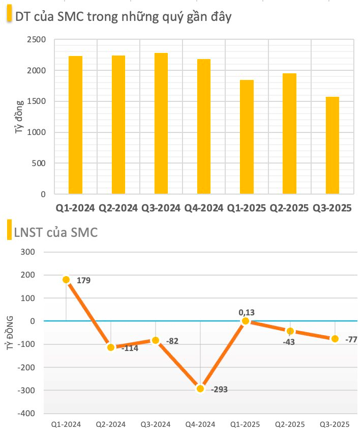 SMC là doanh nghiệp buôn thép có lịch sử gần 35 năm, từng ghi nhận giai đoạn tăng trưởng mạnh vào năm 2021 với doanh thu hơn 21.300 tỷ đồng và lợi nhuận sau thuế xấp xỉ 901 tỷ đồng. Tuy nhiên, từ năm 2022, khi thị trường thép suy giảm, công ty nhanh chóng đối mặt với áp lực lớn do các khoản phải thu phát sinh từ nhóm khách hàng bất động sản và xây dựng. Dòng tiền bị đình trệ tại các đối tác như Hòa Bình, Novaland… đã khiến hoạt động kinh doanh của SMC chịu sức ép kéo dài trong hai năm gần đây.