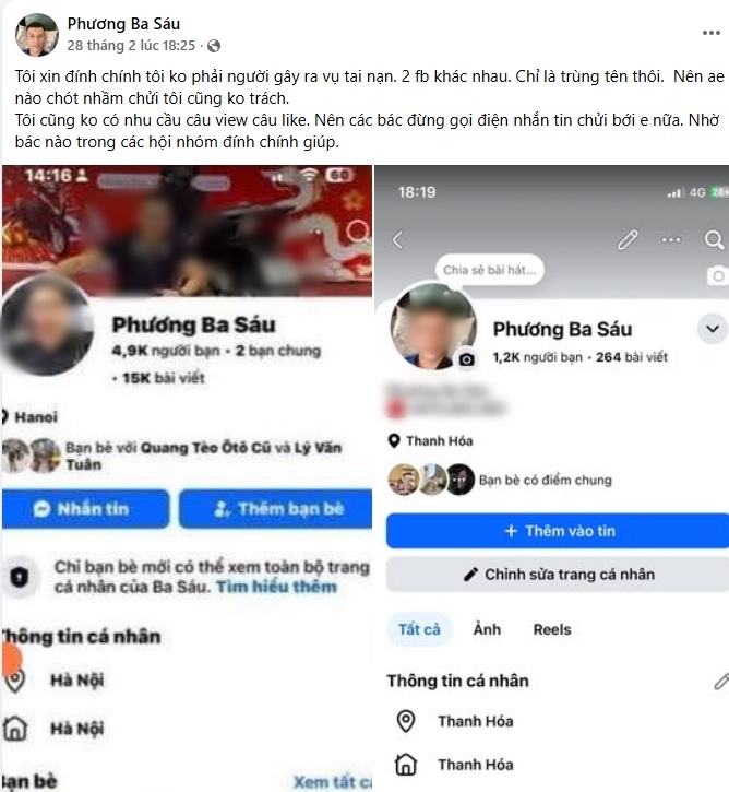 Cùng thời điểm, một tài khoản Facebook cũng tên "Phương Ba Sáu" - chủ tài khoản là anh Lê Minh Phương (SN 1990, trú phường Hàm Rồng, Thanh Hóa) liên tục bị cư dân mạng công kích. Anh Phương bị nhầm là tài xế xe bán tải trong vụ việc.
