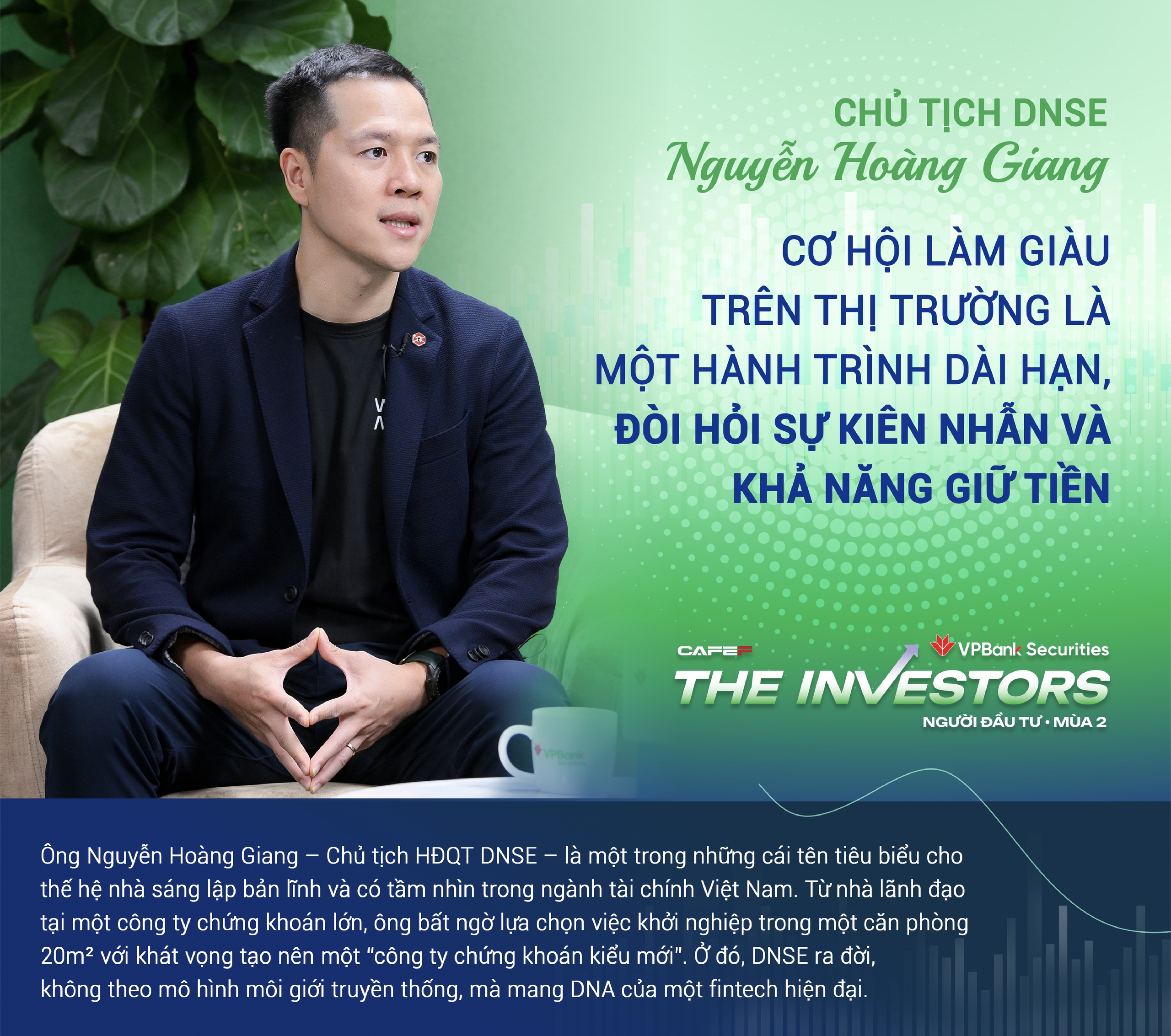 Ông Nguyễn Hoàng Giang: Khi bắt đầu DNSE, tôi chỉ mong muốn xây dựng một nền tảng giao dịch chứng khoán thực sự tốt và tiện lợi cho nhà đầu tư. Đơn giản từ việc giúp họ dễ dàng thấy được được họ đang thực sự kiếm được bao nhiêu từ việc đầu tư, không chỉ là chênh lệch giá mua bán mà cả các chi phí như thuế, lãi suất…