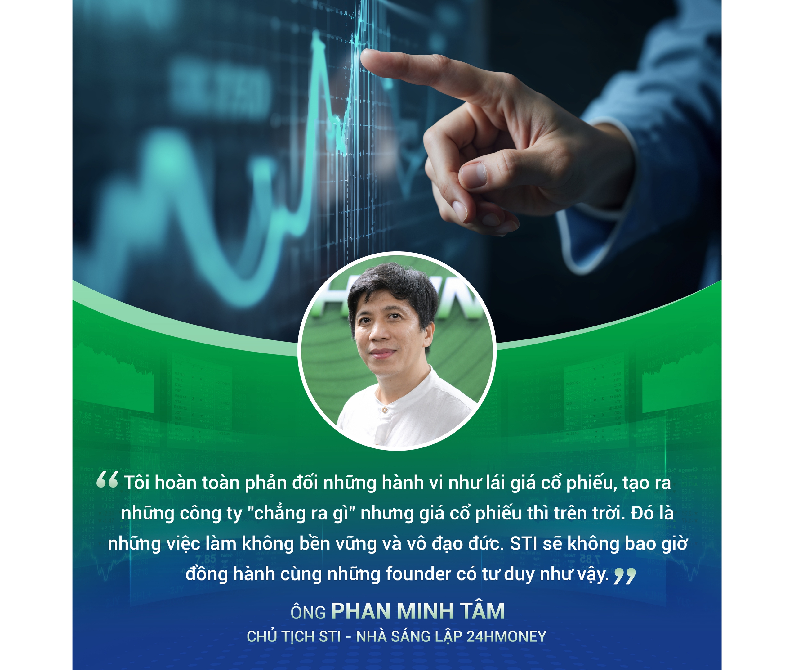 Chính vì quan điểm này, tôi hoàn toàn phản đối những hành vi như lái giá cổ phiếu, tạo ra những công ty "chẳng ra gì" nhưng giá cổ phiếu thì trên trời. Đó là những việc làm không bền vững và vô đạo đức. STI sẽ không bao giờ đồng hành cùng những founder có tư duy như vậy.