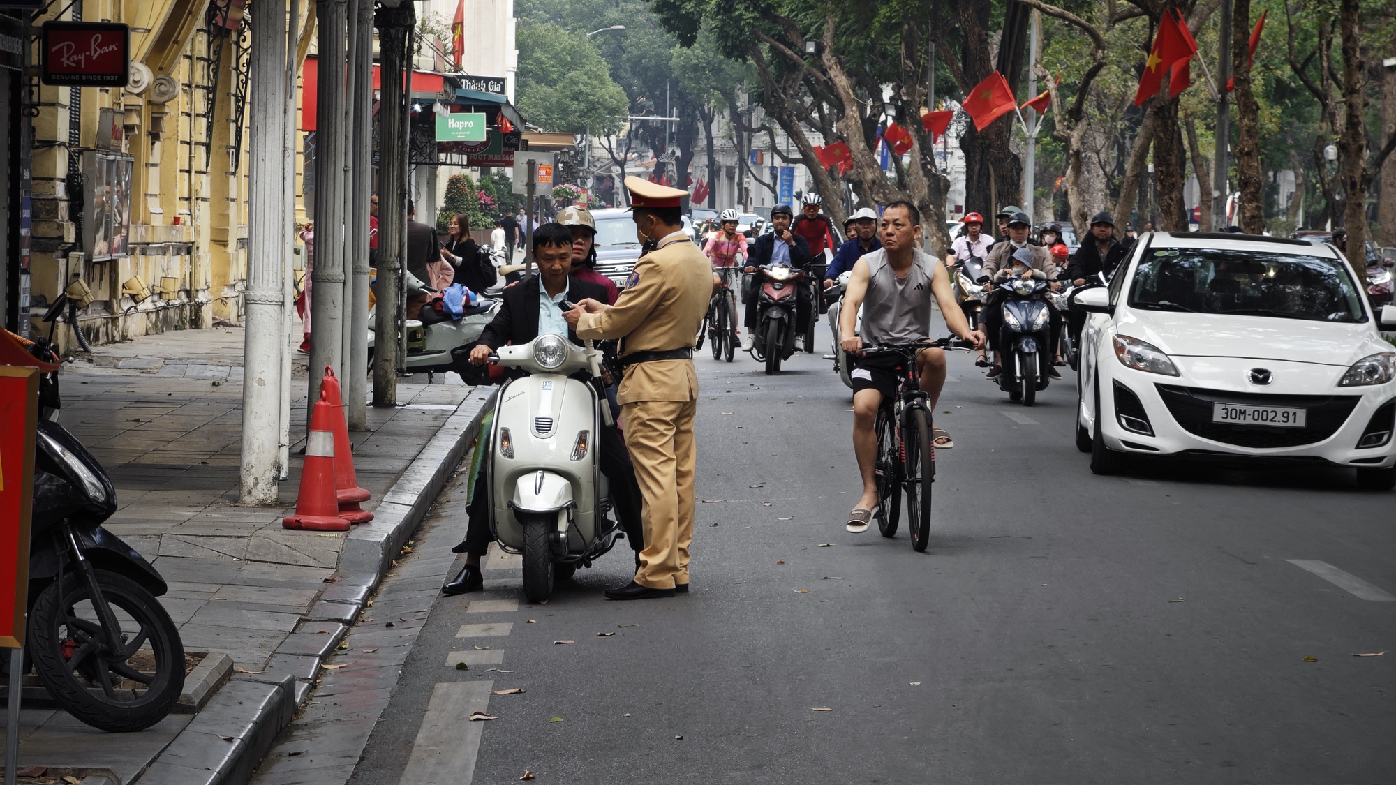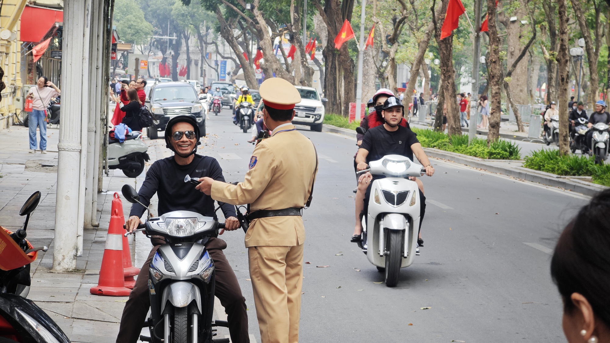 Ghi nhận trong sáng mùng 1, lực lượng CSGT tại Hà Nội đã tổ chức kiểm tra nồng độ cồn tại một số tuyến phố trung tâm. Khoảng 10h, một tổ công tác lập chốt tại khu vực Hồ Gươm, tiến hành dừng phương tiện theo đúng quy trình.