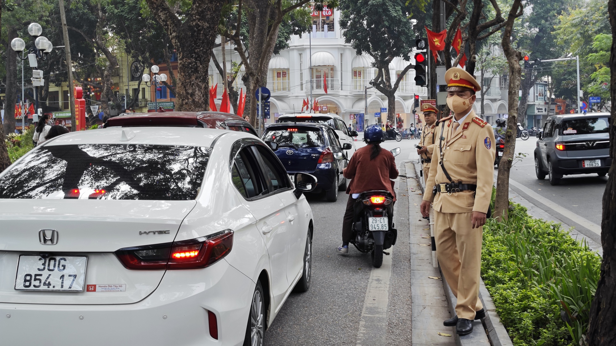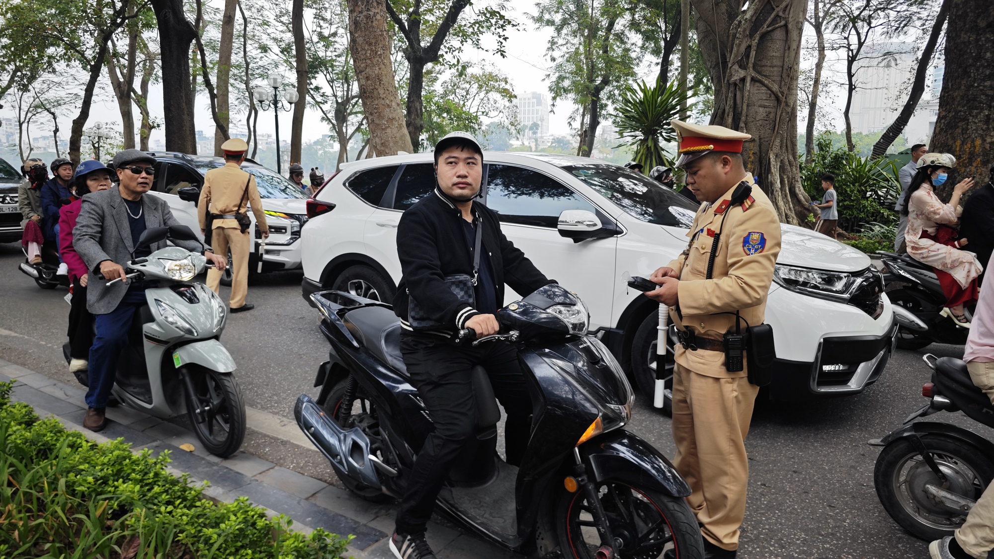 10h sáng mùng 1, lực lượng CSGT lập chốt kiểm tra nồng độ cồn tại khu vực Hồ Gươm.