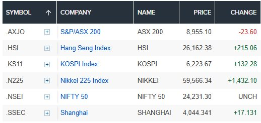 Tại khu vực Châu Á, chỉ số Kospi của Hàn Quốc tăng 1,74% trong khi chỉ số Kosdaq của nhóm cổ phiếu vốn hóa nhỏ tăng 1,09%. Chỉ số Nikkei 225 của Nhật Bản tăng 1,58% và chỉ số Topix tăng 1,06%.