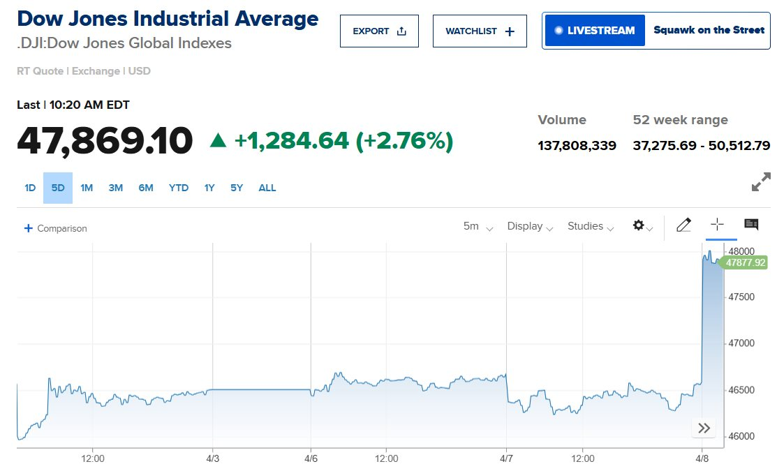 Chứng khoán Mỹ xanh rực rỡ, Dow Jones tăng dựng đứng 1.300 điểm, giá dầu sụt sâu sau thoả thuận ngừng bắn Mỹ- Iran