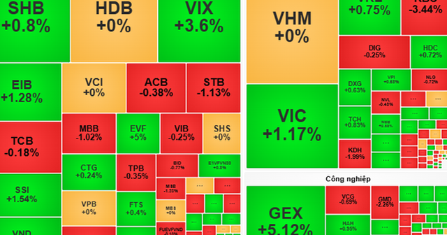 Bước vào phiên chiều, hàng loạt cổ phiếu lớn của các nhóm ngành đều tăng điểm tích cực. VCB, VIC, VHM và FPT là các cổ phiếu vốn hóa lớn dẫn dắt xu hướng tăng điểm trên thị trường.