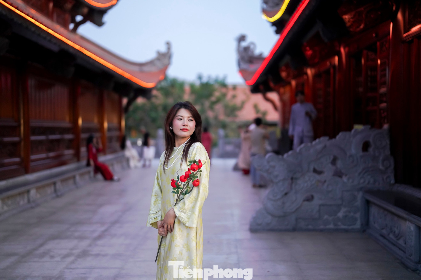 Những ngày đầu năm, đông đảo bạn trẻ chọn Tu viện Vĩnh Nghiêm làm điểm đến để lưu giữ những bộ ảnh áo dài kỷ niệm. Dưới ánh đèn vàng vừa hắt lên khi hoàng hôn buông xuống, không gian tu viện trở nên lung linh và đậm chất điện ảnh.