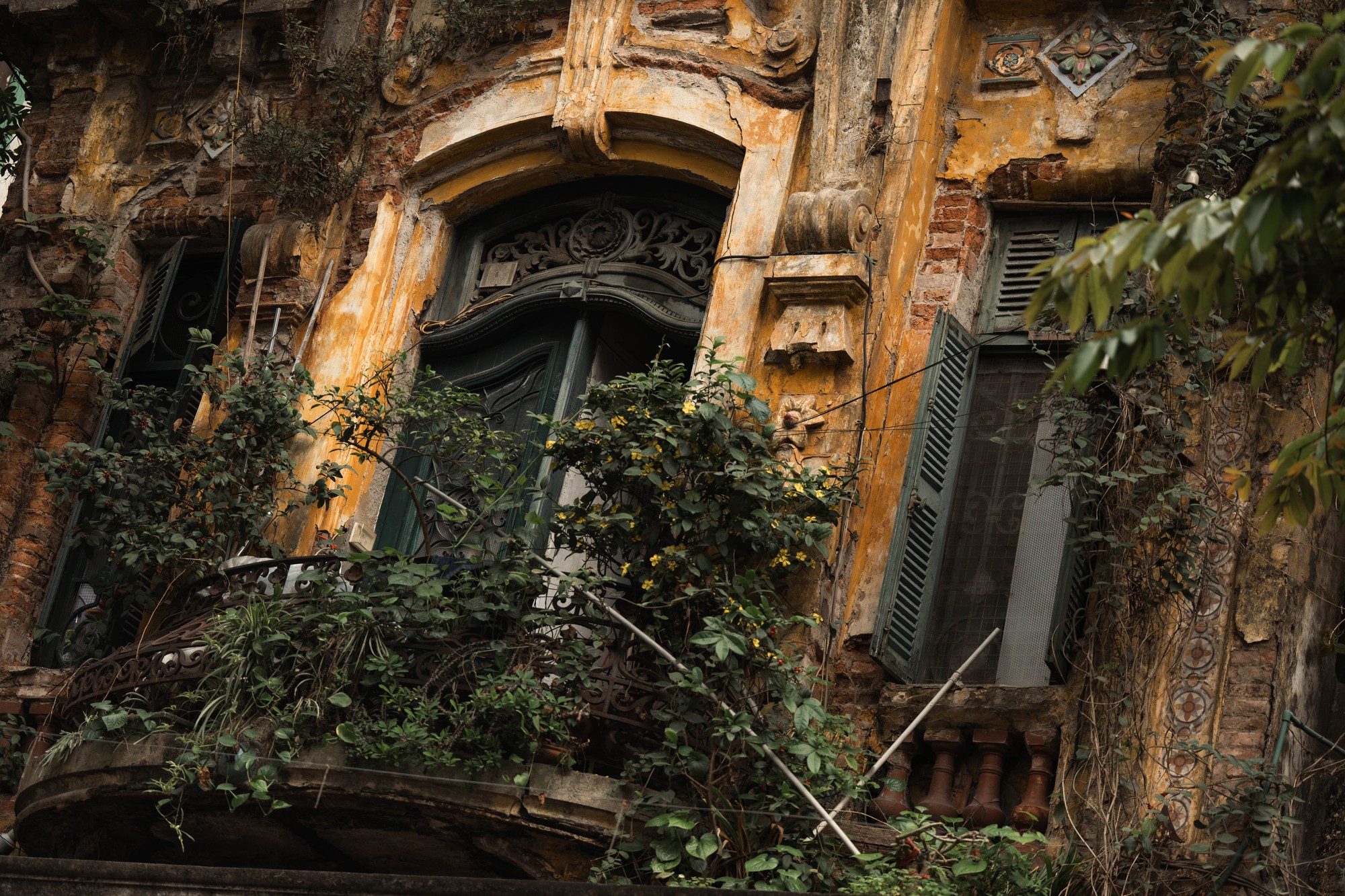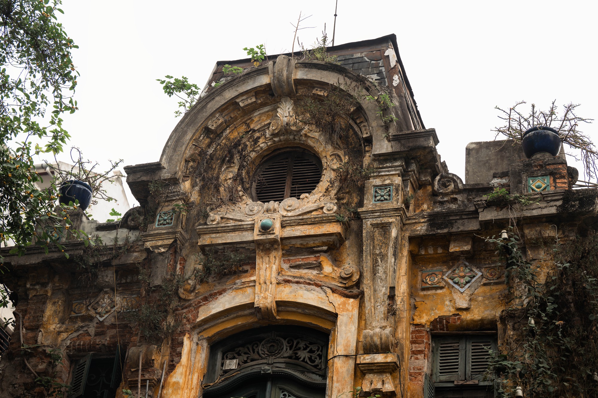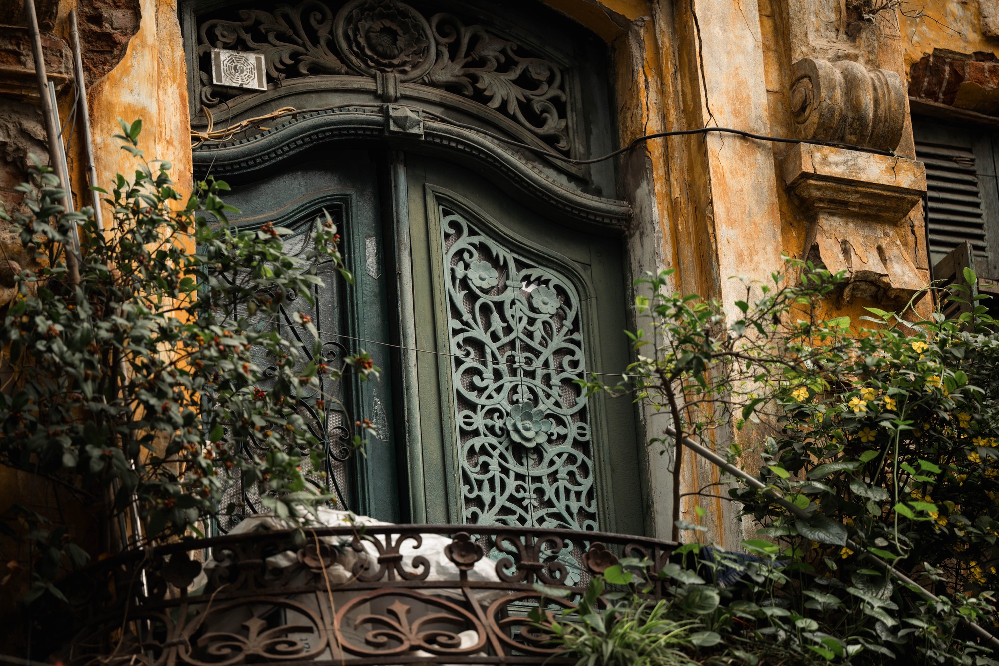 Những đường phào chỉ châu Âu cầu kỳ nay đã vụn vỡ ít nhiều nhưng bộ cửa đối xứng vẫn giữ nguyên nét nền nếp của một gia đình trâm anh thế phiệt xưa cũ. Điểm xuyết trên đó là những miếng gốm men ngọc - thứ màu xanh đã dịu đi, như đang cố canh giữ chút ánh sáng cuối cùng của một thời vàng son.