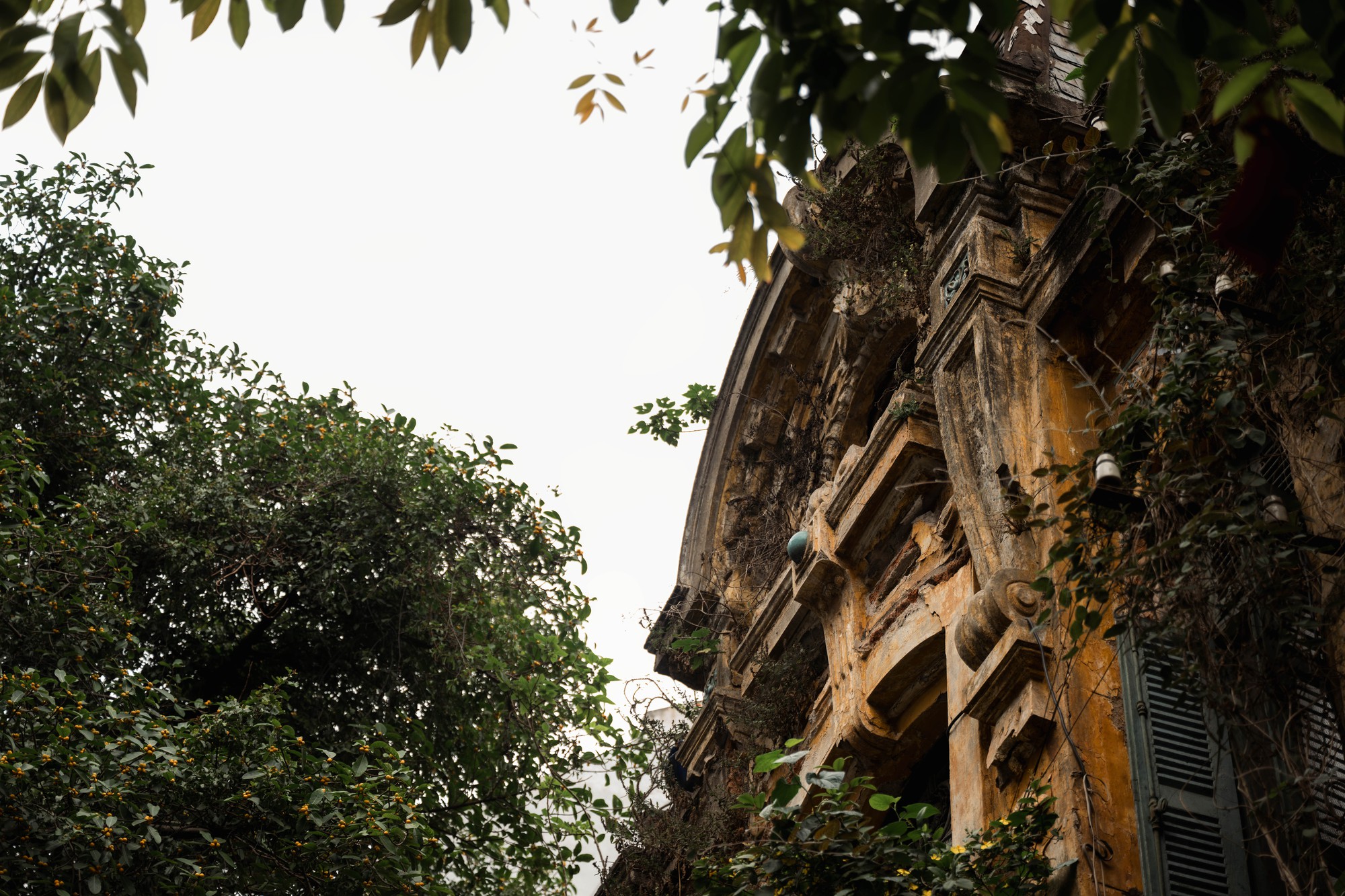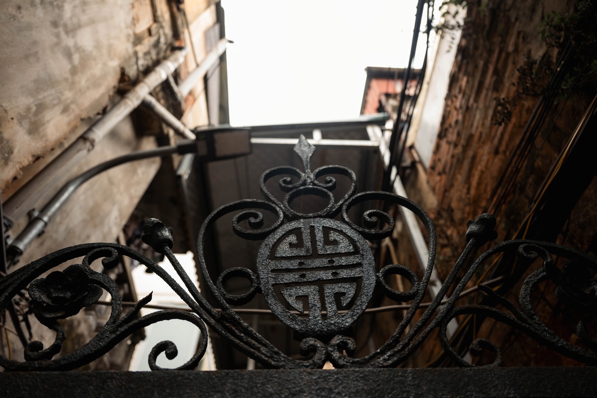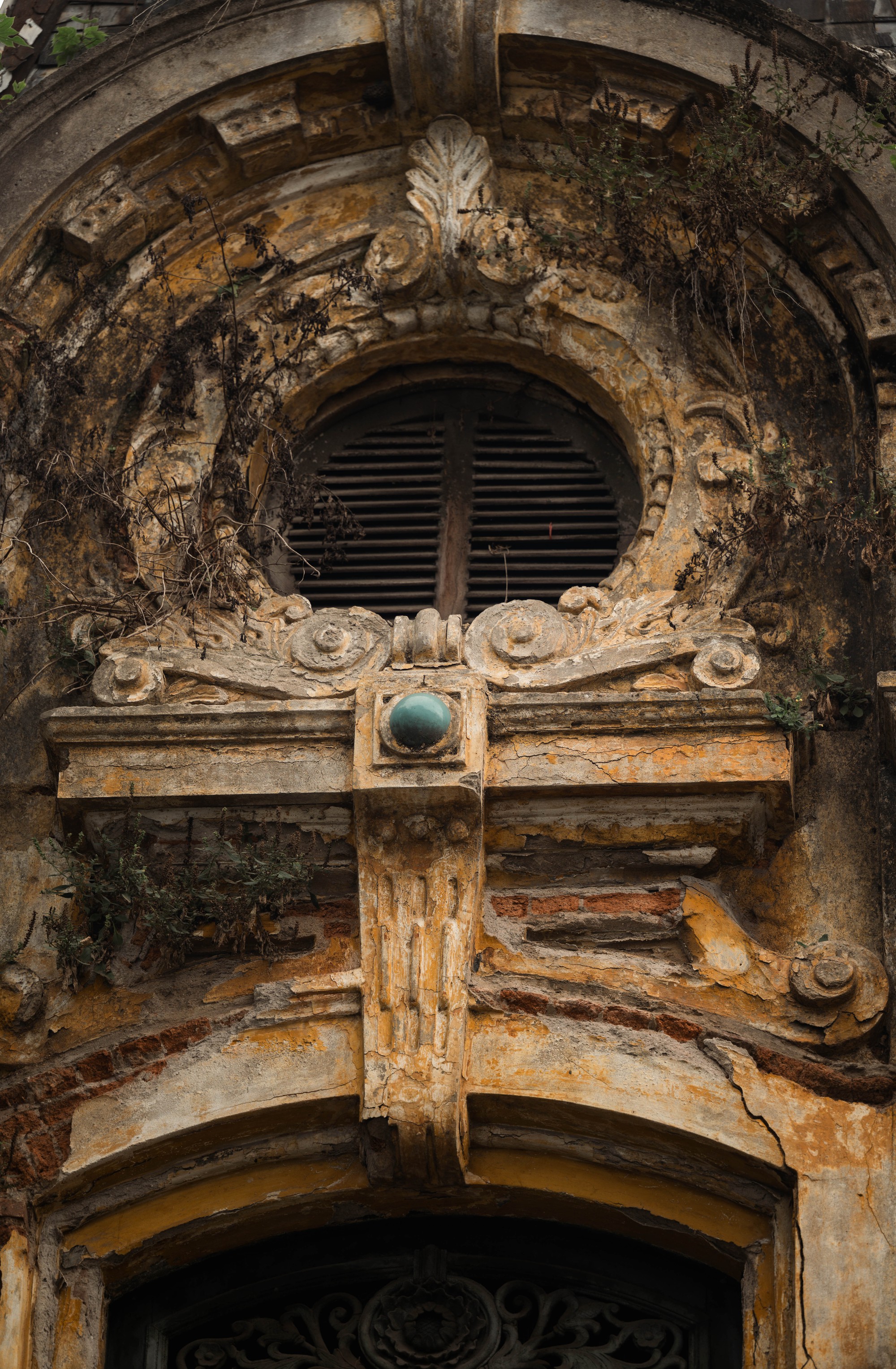 Những đường phào chỉ châu Âu cầu kỳ nay đã vụn vỡ ít nhiều nhưng bộ cửa đối xứng vẫn giữ nguyên nét nền nếp của một gia đình trâm anh thế phiệt xưa cũ. Điểm xuyết trên đó là những miếng gốm men ngọc - thứ màu xanh đã dịu đi, như đang cố canh giữ chút ánh sáng cuối cùng của một thời vàng son.