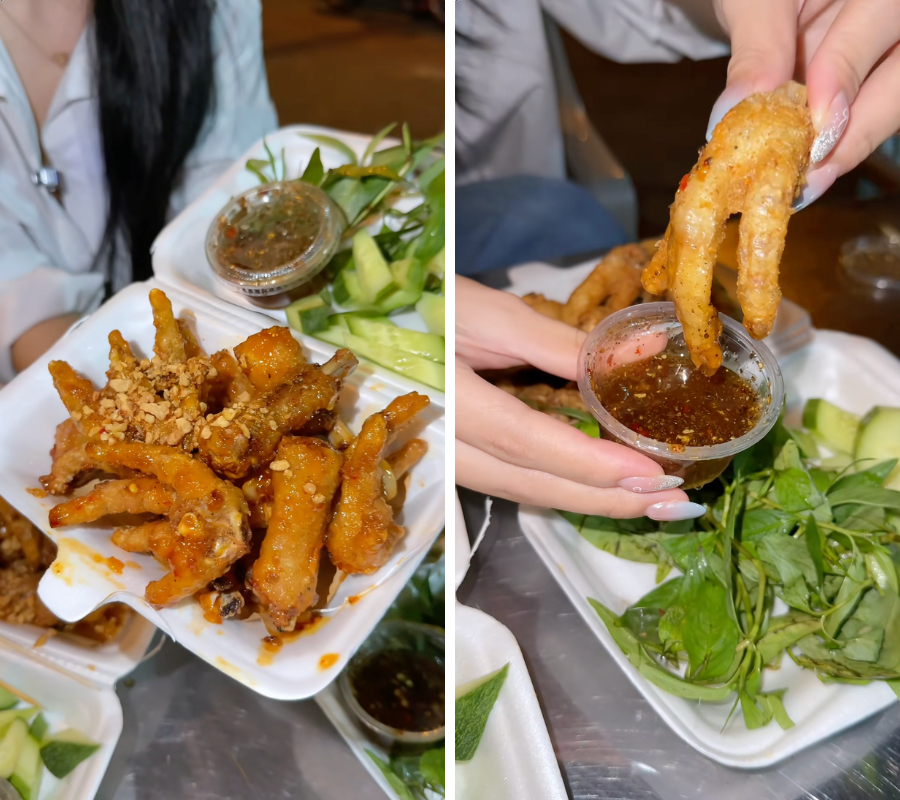 Thực đơn của quán khá đa dạng với mức giá 80.000 VNĐ và 90.000 VNĐ cho các loại chân gà sốt đặc trưng như xóc muối, mắm tỏi, bơ tỏi. Đây cũng chính là điểm đặc biệt khiến quán luôn trong tình trạng quá tải. Chính sự tung hô quá nhiệt tình từ các chiến thần thẩm định mạng đã khiến tọa độ lề đường này trở thành điểm đến quốc dân trong suốt thời gian dài.