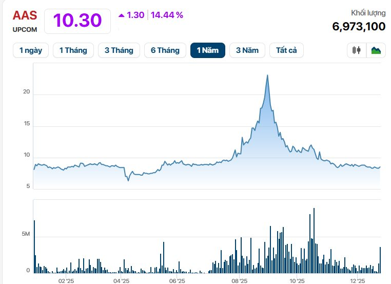 Trong quá khứ, AAS cũng từng gây chú ý khi dậy sóng tăng bốc bằng lần, sau đó nhanh chóng hạ nhiệt. Cụ thể, mã này đã có quãng bứt tốc mạnh hồi giữa năm 2025, thị giá từ vùng 7.000 đồng/cp hồi tháng 4/2025 leo lên mức đỉnh lịch sử 23.000 đồng/cp (phiên 28/8), tương ứng mức tăng gần 230% sau khoảng 4 tháng. Tuy nhiên chỉ trong vòng 1 tháng sau đó, mã chứng khoán này đã “bay” hơn 50% giá trị, dựng cây thông trên đồ thị giá.