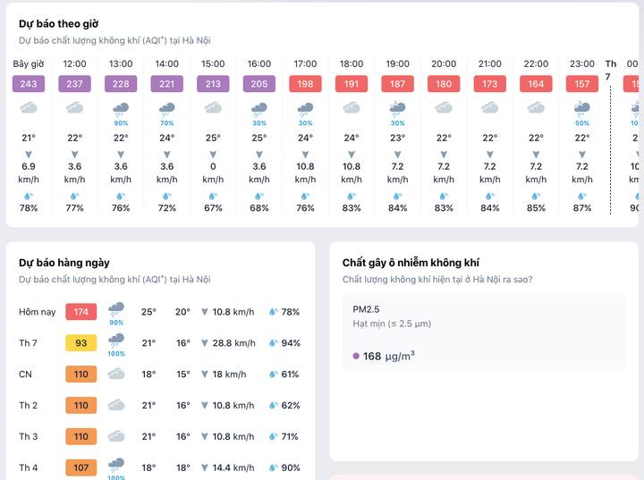 Theo dữ liệu từ ứng dụng đo chất lượng không khí IQAir, tại thời điểm Hà Nội ô nhiễm nặng như hôm nay (12/12), nồng độ PM2.5 được ghi nhận ở mức trung bình 174 µg/m³, cao gấp 33,6 lần khuyến cáo thường niên của Tổ chức Y tế Thế giới (WHO).