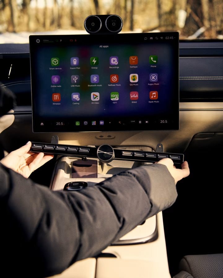 Vài năm trước, tôi đã phàn nàn gay gắt về việc Tesla và các hãng khác loại bỏ nút bấm vật lý để chuyển sang cảm ứng hoàn toàn. Với Xiaomi, bạn không cần phải lựa chọn. Họ bán kèm một thanh điều khiển mỏng hít bằng nam châm vào cạnh dưới màn hình, mang lại các nút bấm cơ học thực thụ để chỉnh nhạc và điều hòa. Một "phép màu" giữa thời đại cảm ứng.