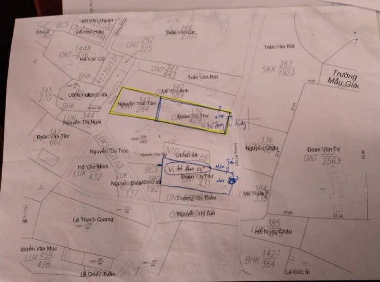 Lô đất khoanh vàng là phần bà Quyên đang sử dụng, phần khoanh màu xanh bằng bút mực là lô đất bà đang đứng tên và là của hàng xóm