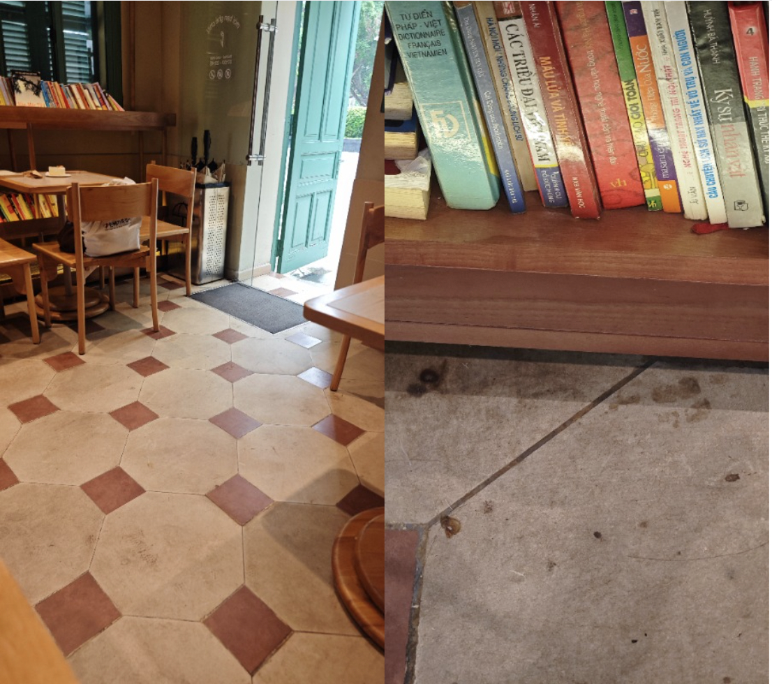 Khu vực giá sách trang trí cũng có những vết ố bẩn loang lổ trên mặt sàn.