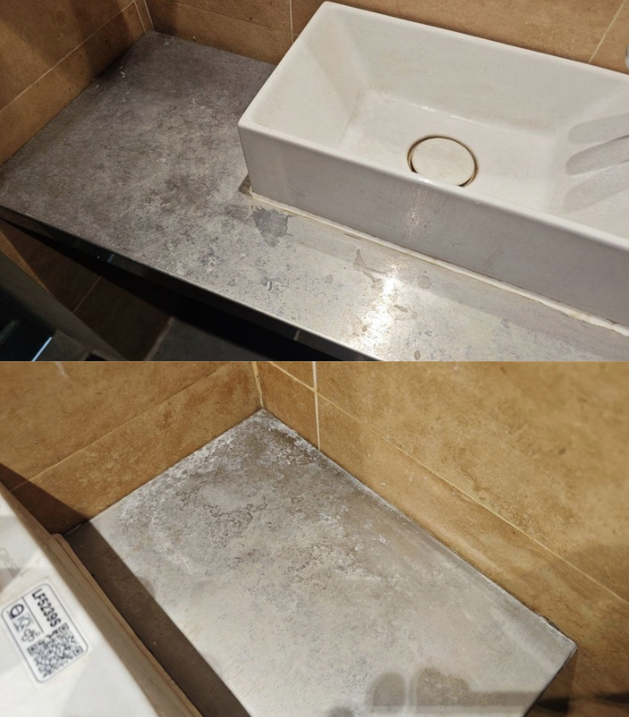 Bồn rửa tay và mặt bàn đá có nhiều vết trầy xước, bong tróc.