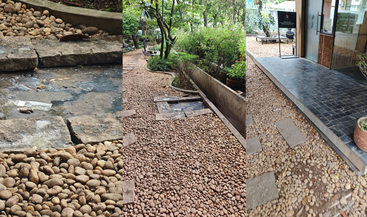Khu vực sân vườn với lối đi rải sỏi có tình trạng đọng nước và mảng bám.